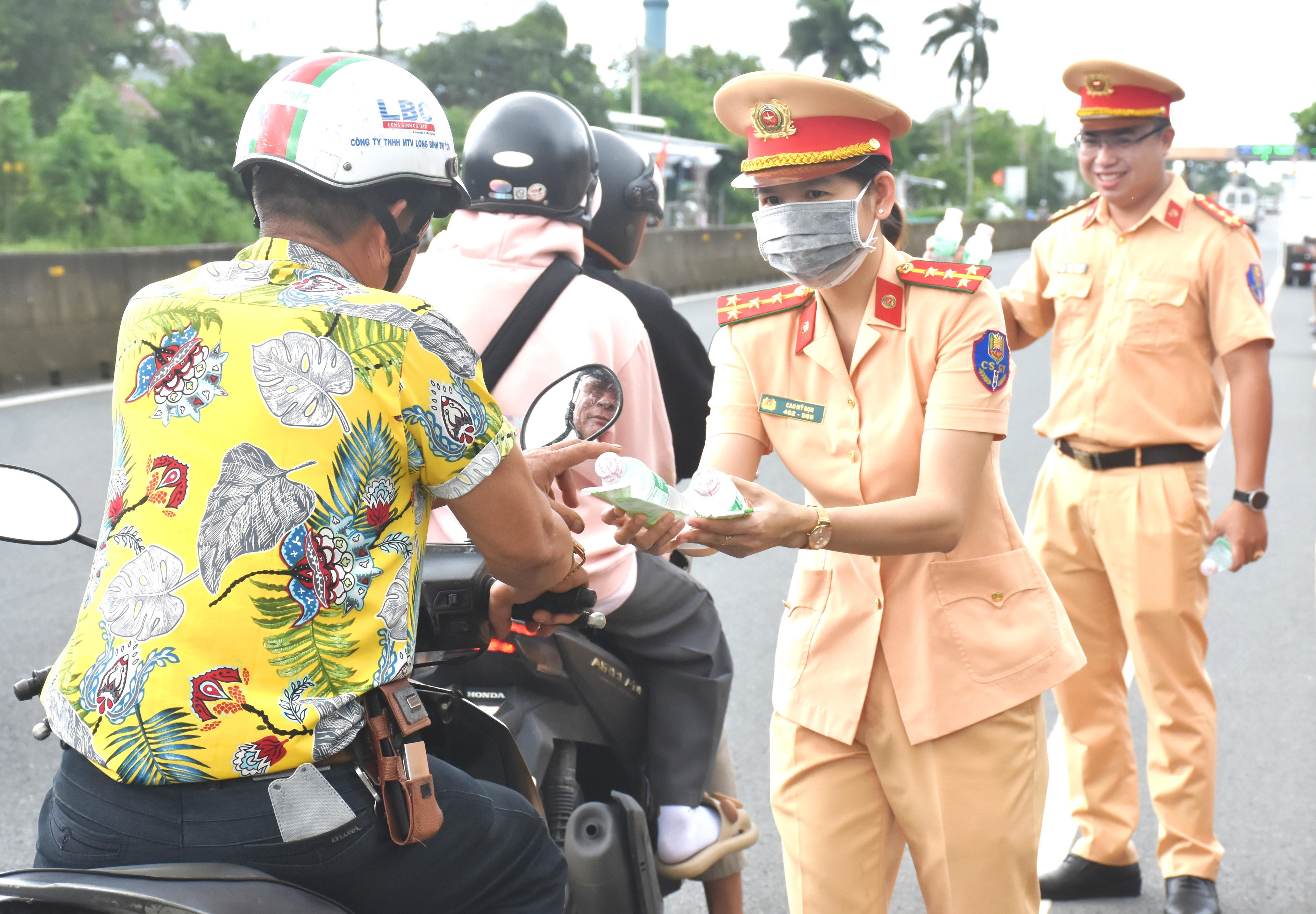 Người dân dừng phương tiện để nhận nước suối từ lực lượng Cảnh sát giao thông. |
