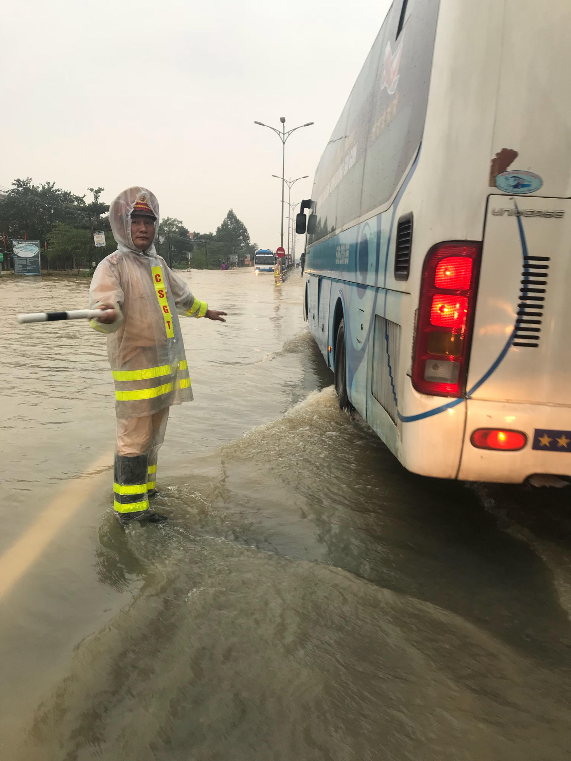Cảnh sát giao thông Huế dầm lũ đội mưa điều tiết giao thông