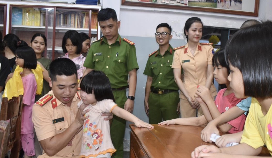Các chiến sỹ CSGT TP. Huế đến với trẻ em tại Chùa Đức Sơn. |