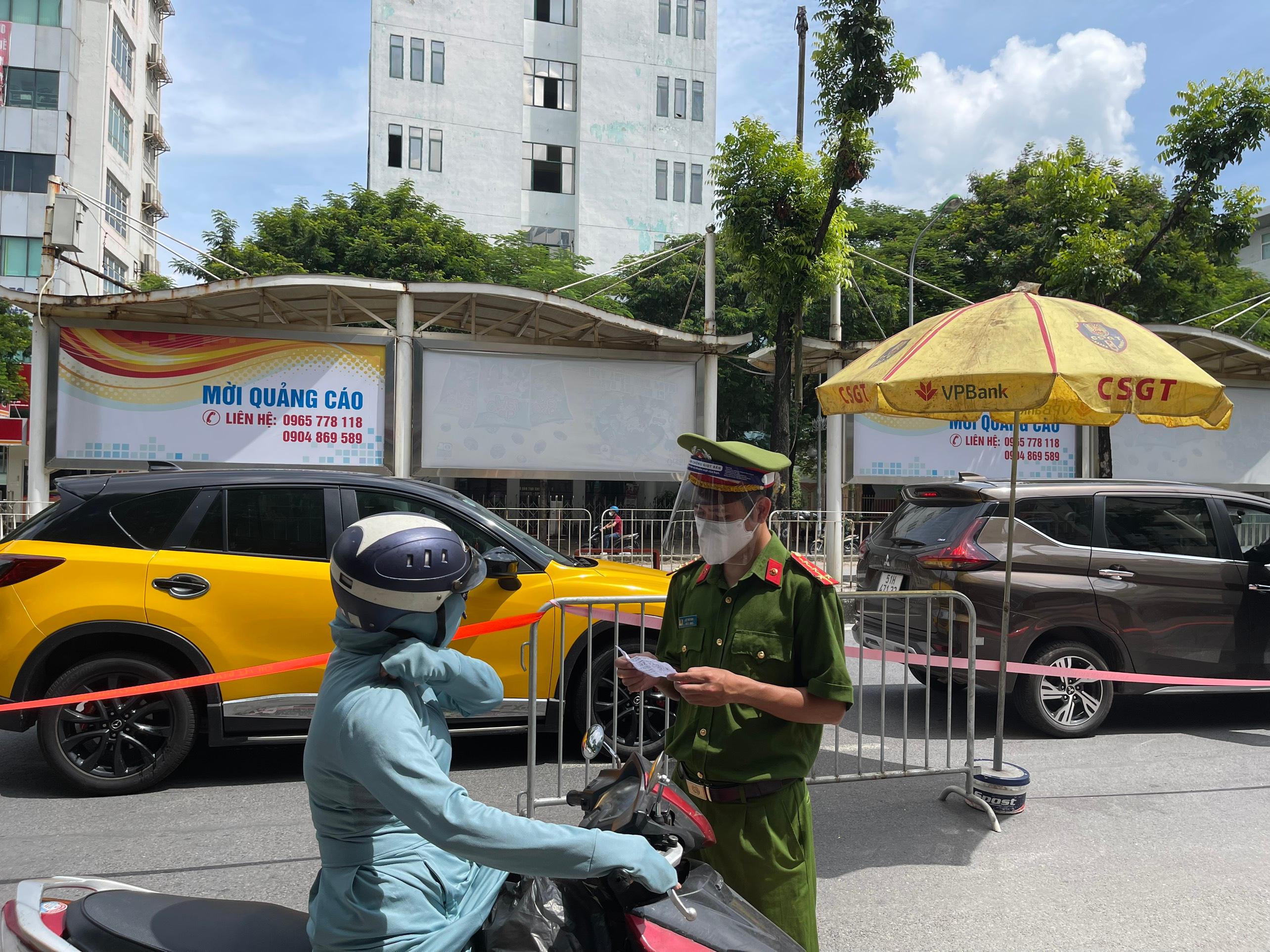 Đại úy Nguyễn Quang Khải, Tổ trưởng tổ 12 thuộc Tổ cơ động mạnh Công an TP Hà Nội đang kiểm tra giấy đi đường của người dân. Ảnh: Mỵ Châu |