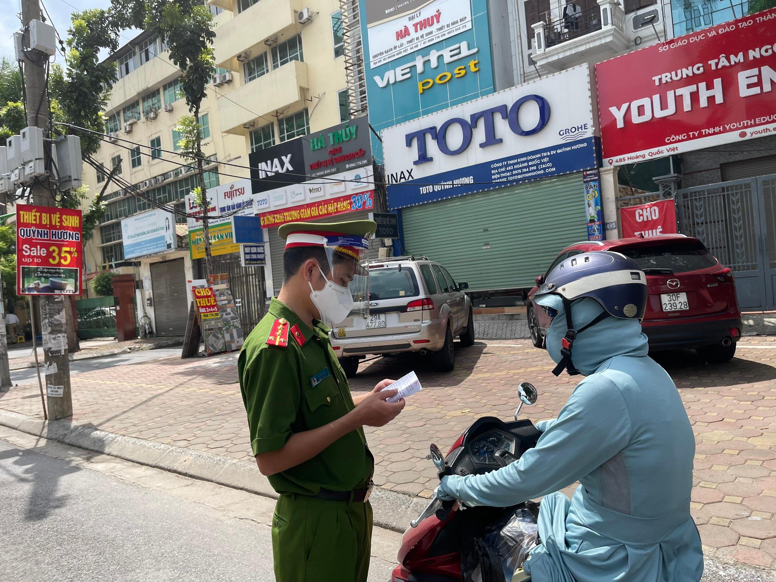 Đường Hoàng Quốc Việt là địa bàn Tổ cơ động mạnh số 9 kiểm soát. Trong buổi sáng nay, tổ công tác đã tiến hành kiểm soát khoảng 1.626 trường hợp, xử phạt 9 trường hợp ra đường không có lý do chính đáng.