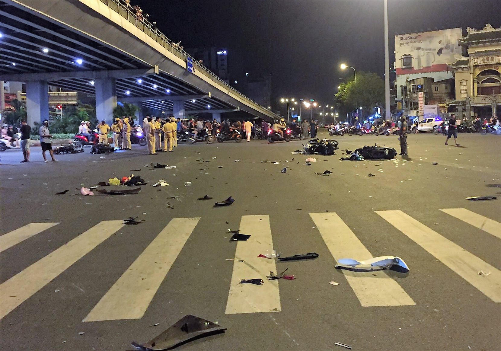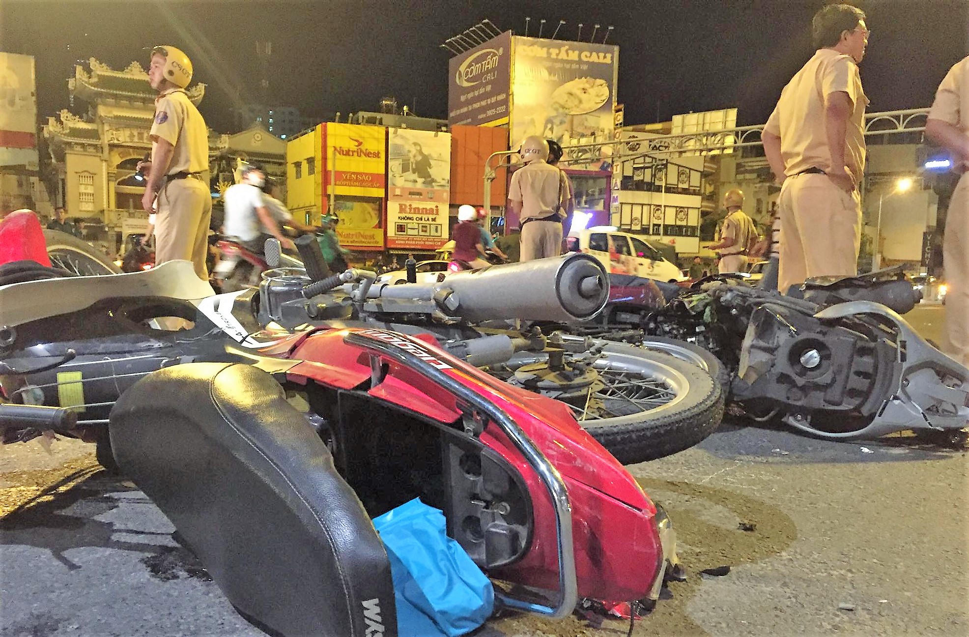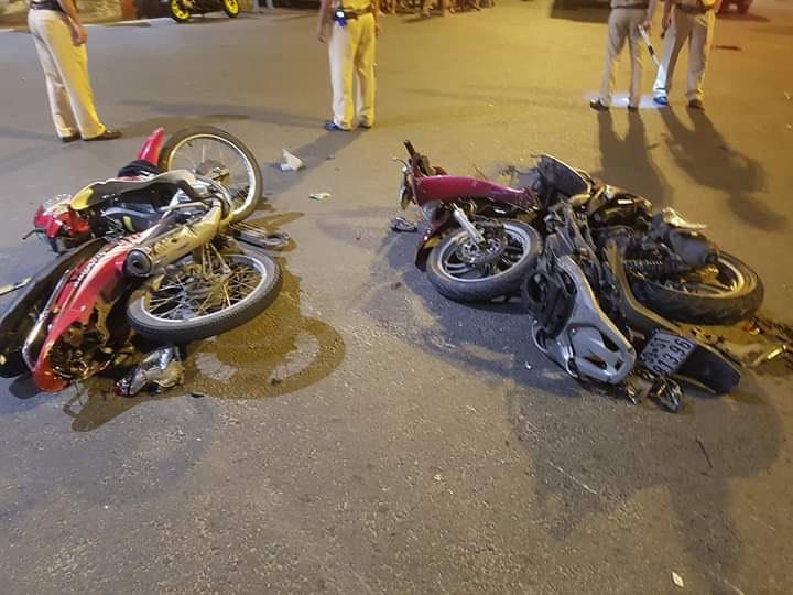 Tại hiện trường, chiếc ô tô BMW 4 chỗ biến dạng hoàn toàn phần đầu. Các xe máy bị tông hư hỏng nghiêm trọng, nhiều bộ phận vỡ nát văng ngổn ngang giữa đường