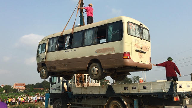 Đến 15h30', xe khách được cẩu lên đường, phần kính xe khách bị vỡ, bên trong xe nhiều ghế bị hư hỏng...