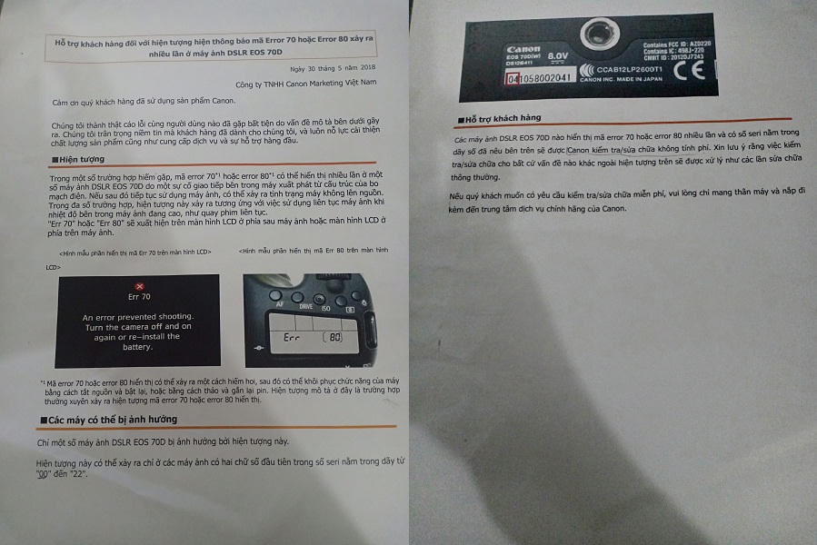 | Bản thông báo “Hỗ trợ khách hàng đối với hiện tượng thông báo mã Error 70 hoặc Error 80 xảy ra nhiều lần ở máy DSLR Eos 70D”