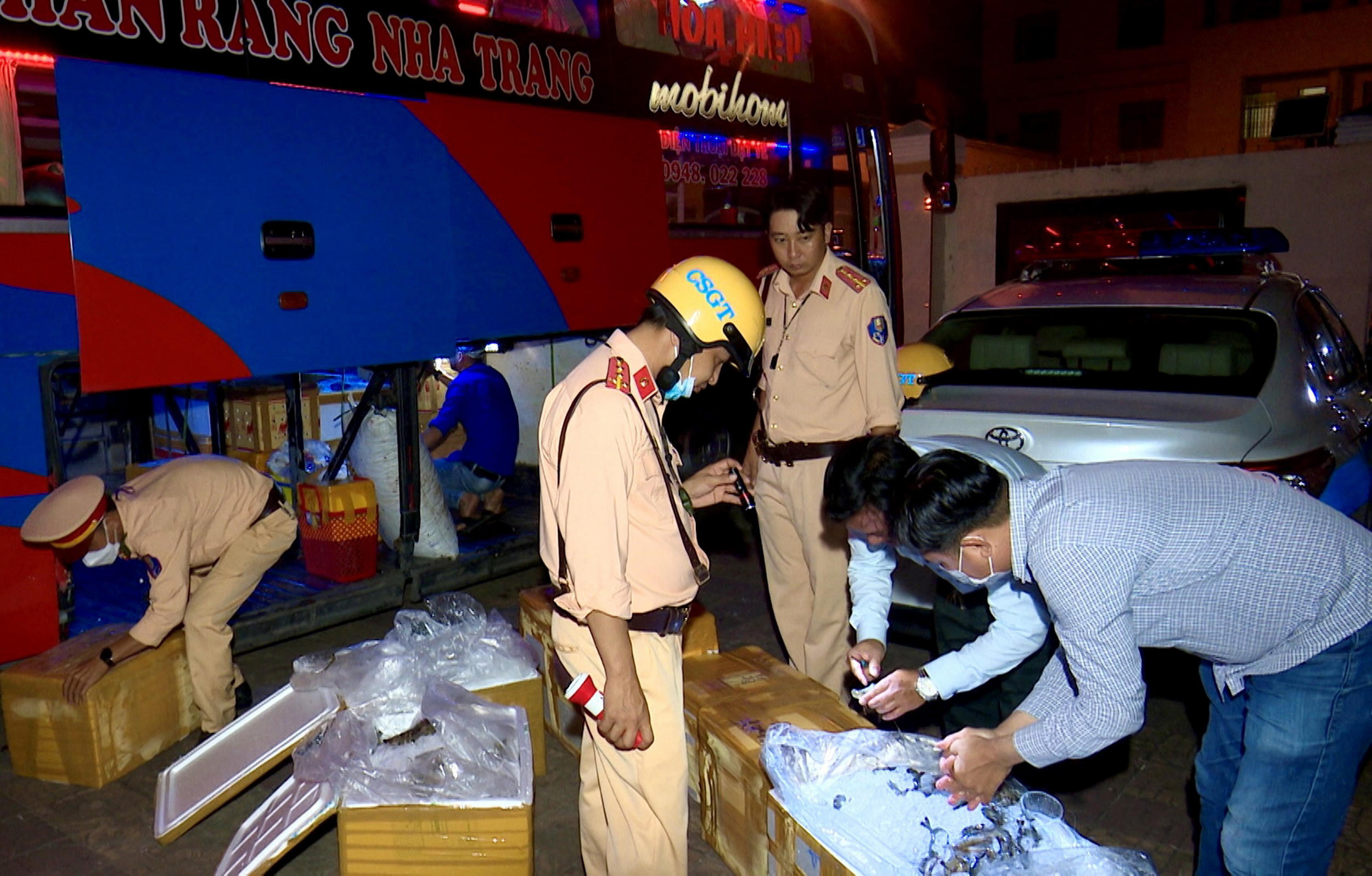 Lực lượng Cảnh sát giao thông đường bộ phát hiện nhiều phương tiện vận chuyển tôm chứa tạp chất đi tiêu thụ. |