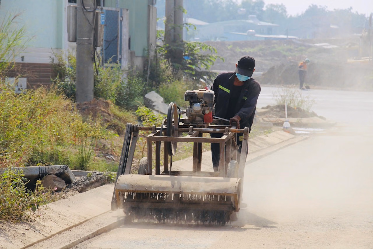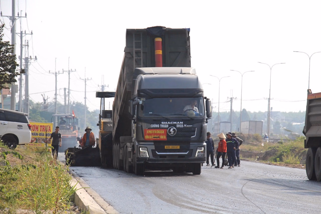 Giữa cái nắng hanh hao của những ngày giáp Tết, từng đoàn xe ben nối đuôi nhau đổ vật liệu, mùi nhựa nóng quyện trong gió. Máy rải bê tông nhựa chậm rãi lăn trên nền đường, phía sau là hàng chục công nhân cúi sát từng mối nối, chỉnh từng centimet mặt đường. Ở đại công trường này, tiến độ không còn được tính theo ca, mà được tính bằng giờ, thậm chí bằng từng khoảng thời gian nắng nóng thuận lợi.