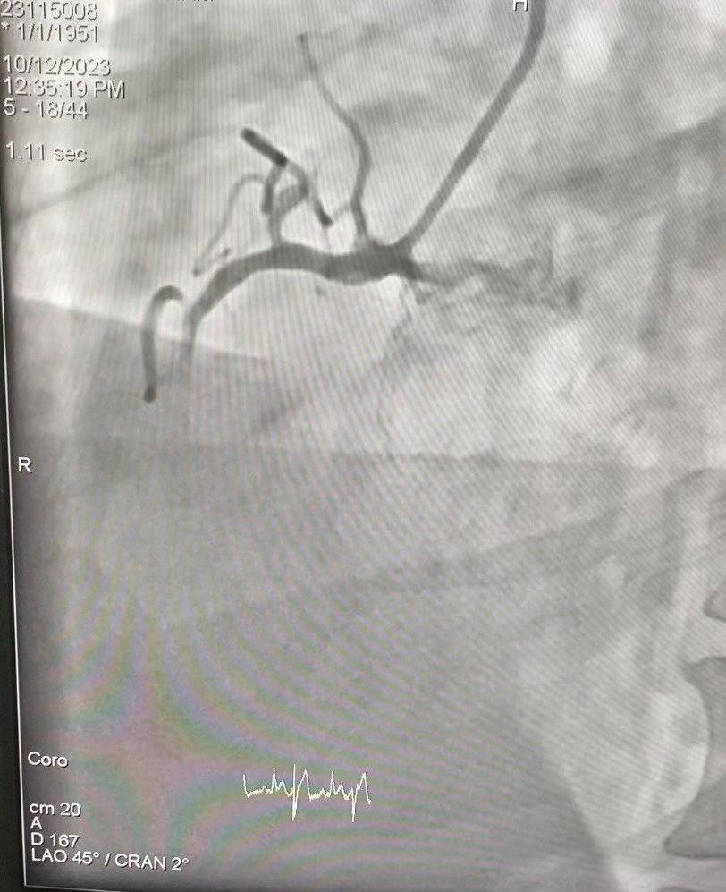 Ngay sau đó, bệnh nhân được chỉ định chụp can thiệp mạch vành cấp cứu. Kết quả là động mạch liên thất trước (LAD) tắc trong stent ở đoạn 2, động mạch vành phải (RCA) tắc cấp trong stent ở đoạn 2, ĐM mũ (LCx) không hẹp. Bệnh nhân được can thiệp cấp cứu với 1 stent, sau can thiệp dòng máu lưu thông qua động mạch vành phải(RCA) tốt (TIMI III), sau 30 phút bệnh nhân hết đau ngực.