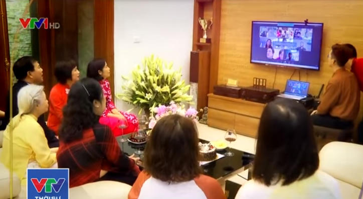 | Họ hàng hai bên ngồi trước màn hình để chứng kiến lễ cưới đặc biệt của vợ chồng Trâm Anh. |