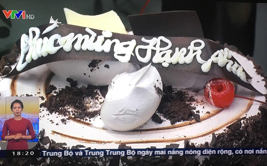 Hai bên gia đình và bạn bè của cô dâu chú rể đứng trước màn hình ti vi để chứng kiến giây phút Trâm Anh và chồng cùng nhau cắt bánh cưới, uống rượu giao bôi.