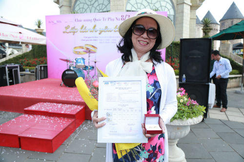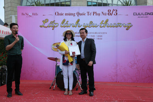 Chiều 8/3, cô Đỗ Thị Xuân Mai - nữ du khách tới từ TP.Hồ Chí Minh đã được trao cặp nhẫn vàng trị giá 10 triệu đồng trong chương trình “Lấp lánh yêu thương” tại Bà Nà Hills diễn ra từ ngày 6/3 đến 14h30 ngày 8/3. Các giải thưởng của chương trình được tài trợ bởi Cửu Long Jerwelry.