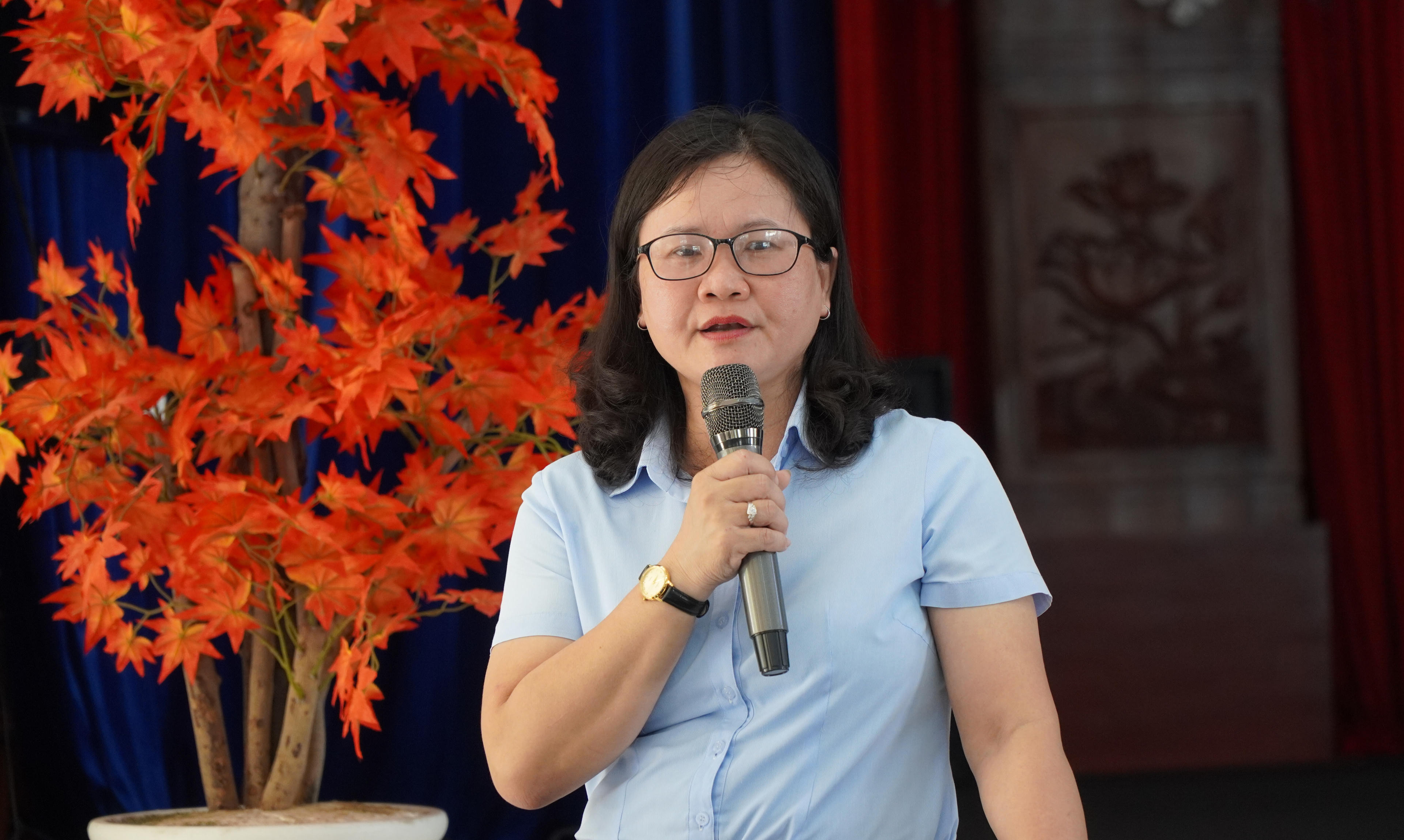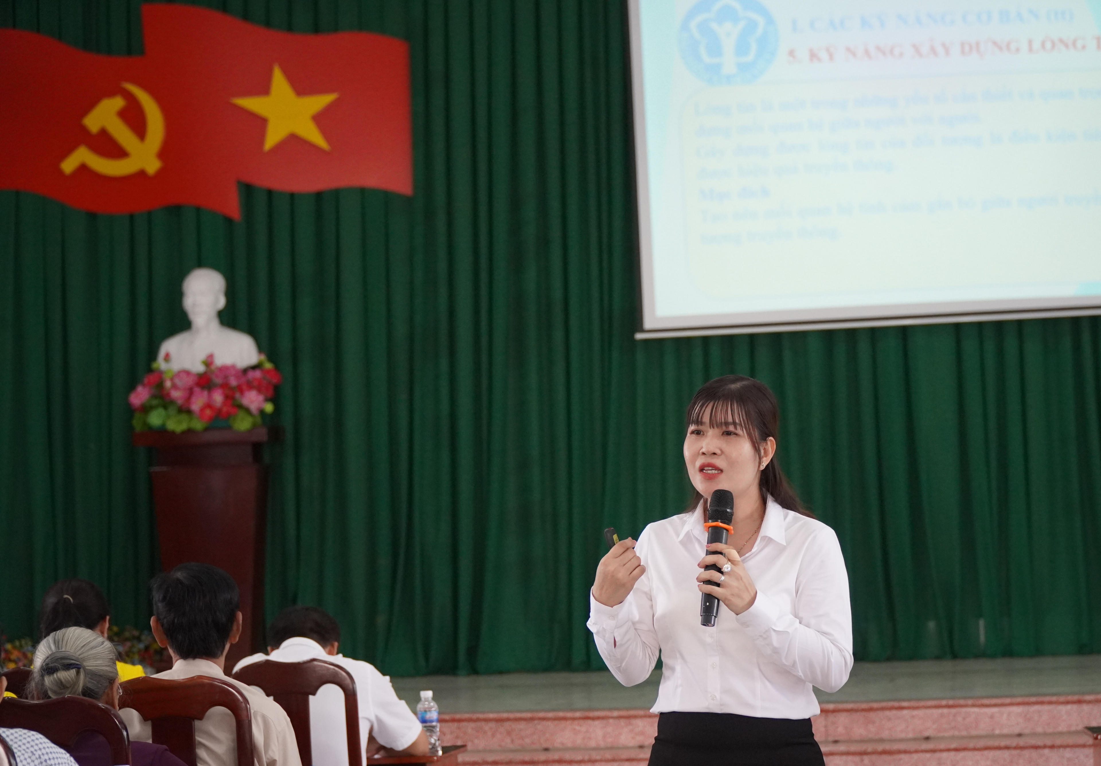 Chuyên viên phòng Truyền thông BHXH tỉnh Trần Thị Hồng Loan hướng dẫn cụ thể các kỹ năng. Ảnh: Kim Ngân |