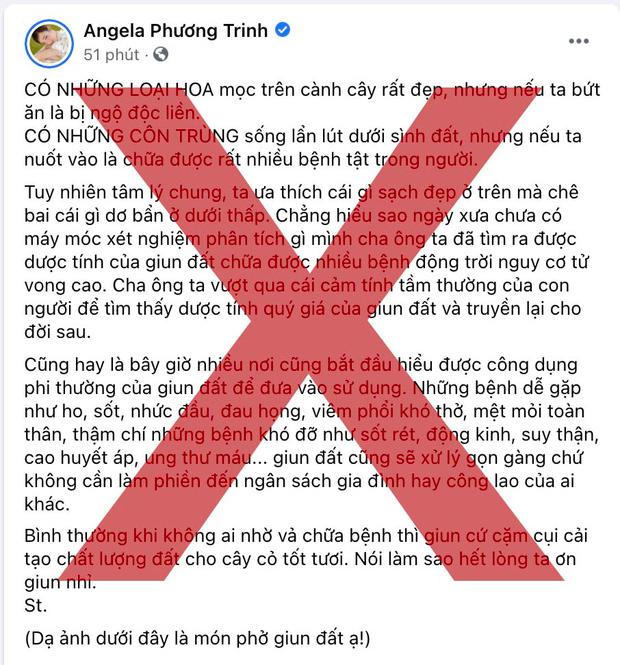 Chiều 28/8, Angela Phương Trinh tiếp tục gây phẫn nộ khi chia sẻ Địa Long có thể chữa được hàng loạt bệnh từ nặng đến nhẹ. Trên trang cá nhân, cô viết: "Những bệnh dễ gặp như ho, sốt, nhức đầu, đau họng, viêm phổi khó thở, mệt mỏi toàn thân, thậm chí những bệnh khó đỡ như sốt rét, động kinh, suy thận, cao huyết áp, ung thư máu... giun đất cũng sẽ xử lý gọn gàng chứ không cần làm phiền đến ngân sách gia đình hay công lao của ai khác". Không chỉ vậy, cô còn đính kèm thêm hình ảnh của món phở giun đất để minh hoạ.
