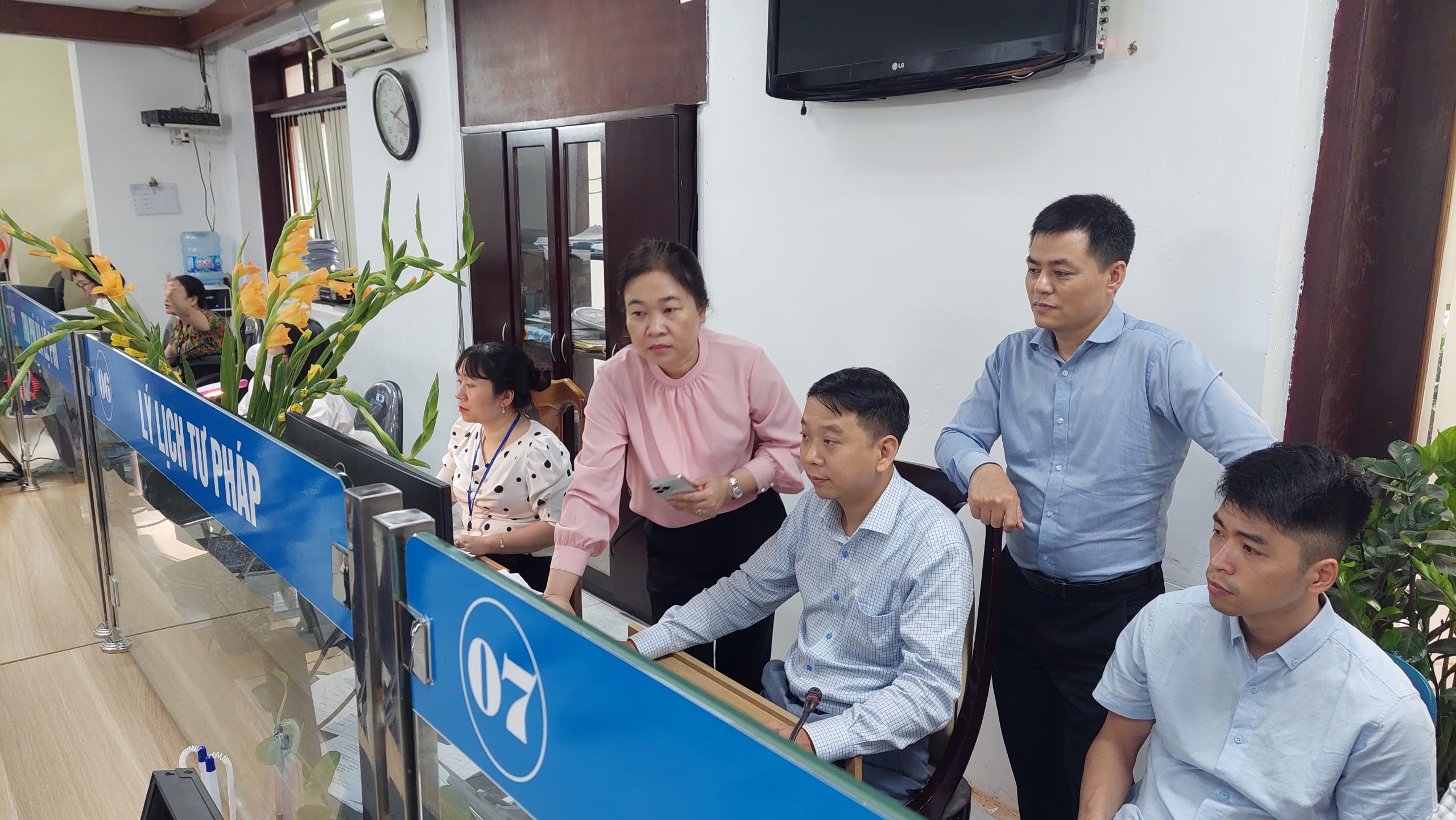 Phó Giám đốc Sở Tư pháp Hà Nội Phạm Thị Thanh Hương hỗ trợ cán bộ Bộ phận một cửa trong quá trình tiếp nhận, xử lý hồ sơ yêu cầu cấp Phiếu LLTP. |