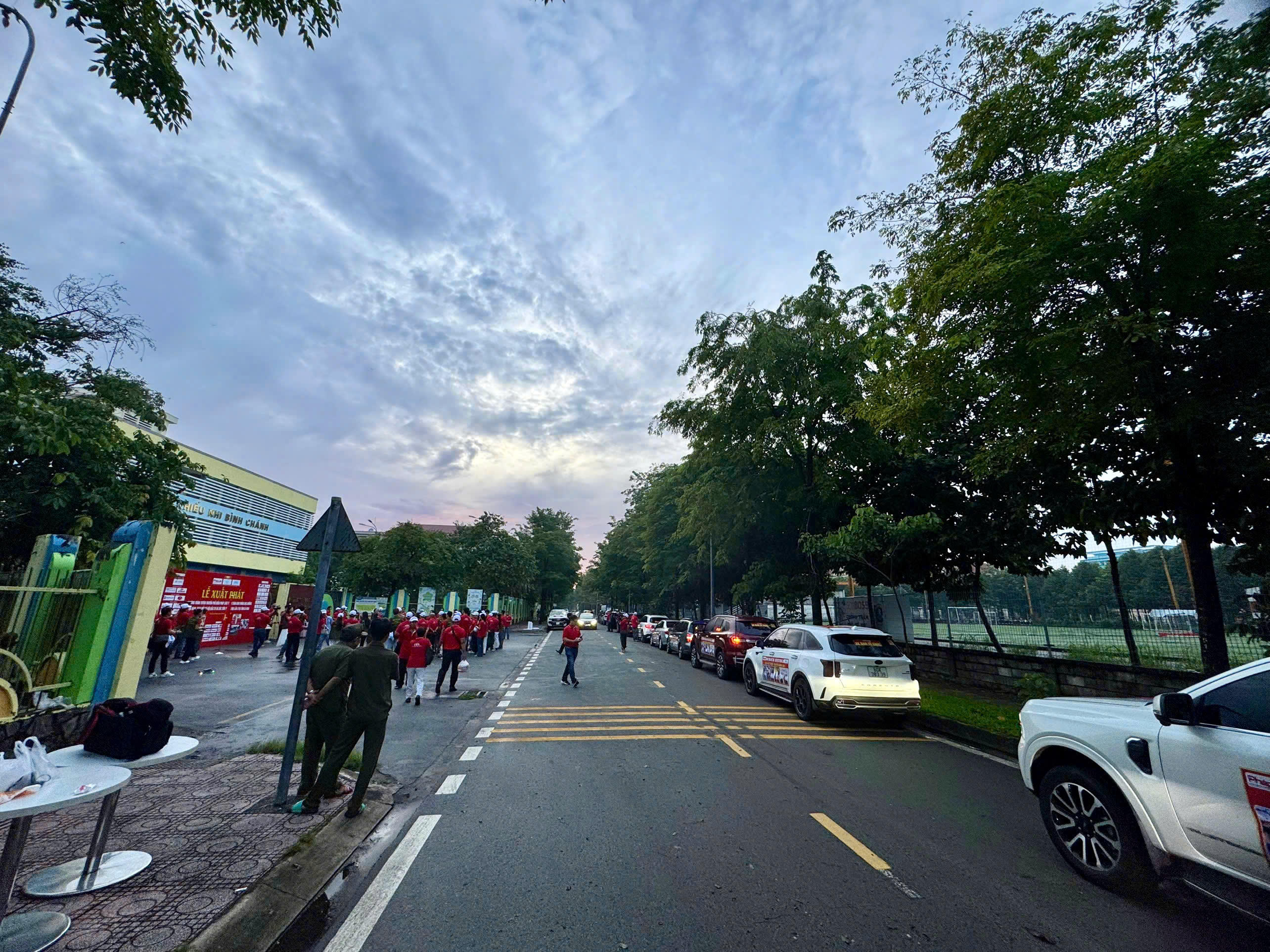 Đoàn xe gồm 42 xe ô tô được dán số từ 01-42 xếp thành hàng tại khu vực tổ chức để chuẩn bị cho hành trình. |