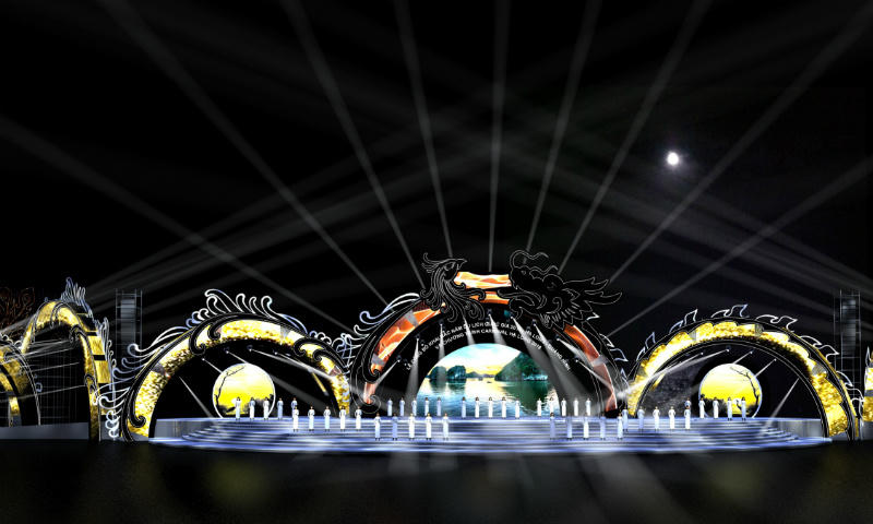 Trên sân khấu với chiều ngang kỷ lục 150m, 9 vòng tròn được kết hợp hoàn hảo với hệ thống đèn Led công nghệ cao và công nghệ video mapping 3D để tạo nên một “miền đất” chân thực, cuốn hút của rồng và phụng.