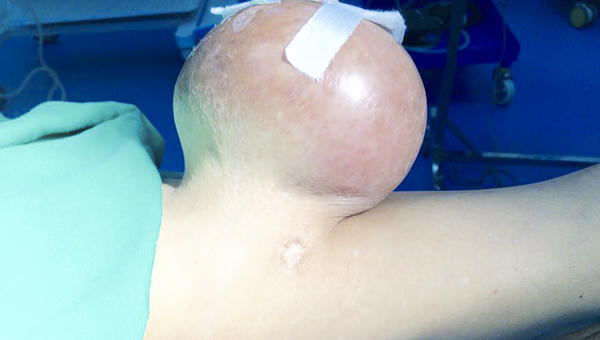 Theo thời gian khối u lớn ngày càng lớn khiến ông H. gặp nhiều khó khăn trong đi lại và sinh hoạt, nhưng vì thấy không đau đớn nên ông không giải quyết. Trong 3 tháng gần đây, khối u phát triển lớn hơn và bị loét rộng trên u gây hiện tượng chảy máu và đau nhức.