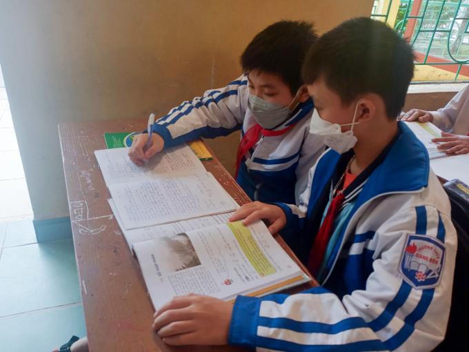 Tuấn Khang giúp Anh Đức ôn lại bài trên lớp, sáng 14/3. Ảnh: Vũ Hà