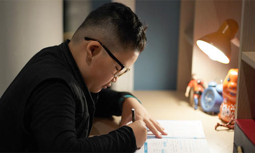 Cậu bé 9 tuổi học ở nhà, trưa 22/2. Ảnh:Thanh Tân. |