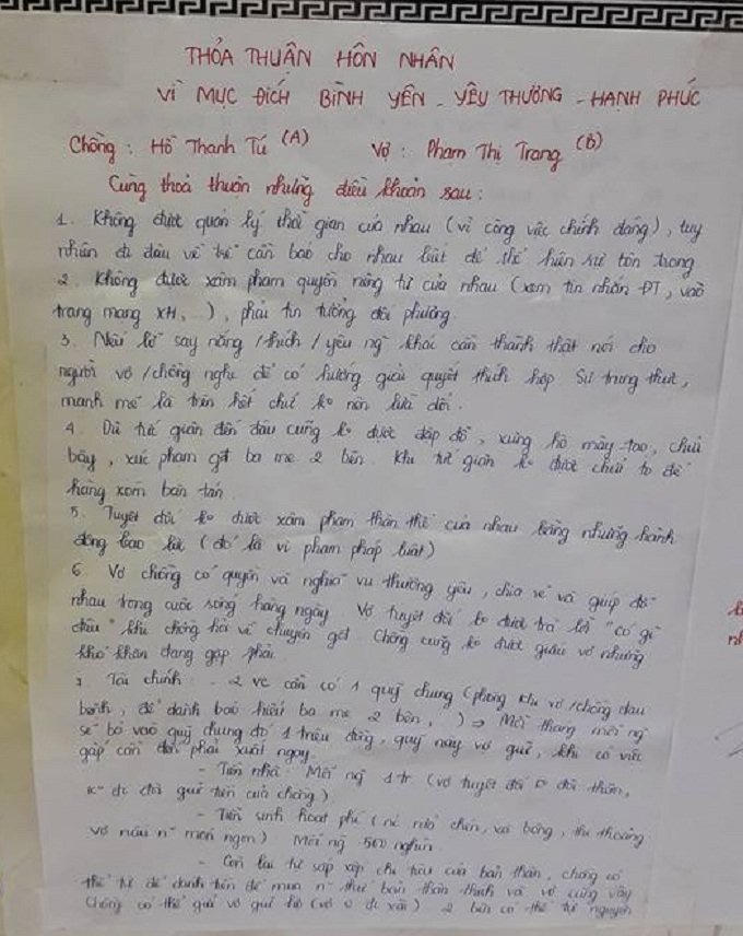 Mới đây, tài khoản Facebook Trang Phạm đăng tải lên mạng xã hội một bản thỏa thuận hôn nhân dễ thương, thu hút sự chú ý của độc giả mạng.