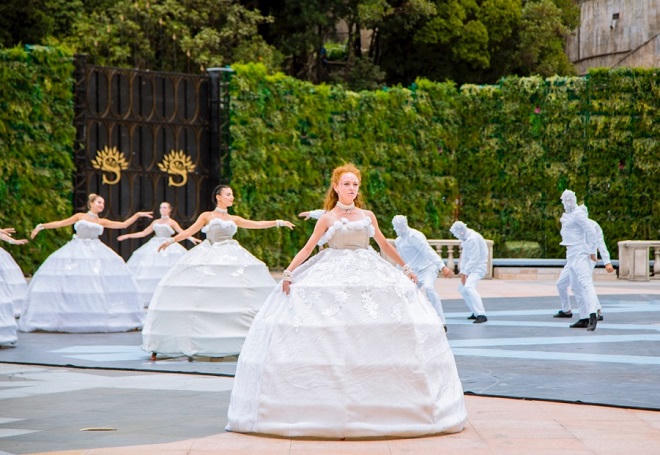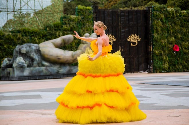 Xứ sở Muôn hoa được khắc hoạ với hình ảnh nam diễn viên là những chiếc lá cây, còn phụ nữ là những đoá hoa hé nụ. Chân váy được thiết kế xếp tầng và pli, có độ rủ xuống tựa như những bông hoa đang dần mở cánh.