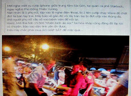 Cũng là một câu chuyện "chém gió" trên mạng hồi tháng 9/2013, một nickname đã chia sẻ bức ảnh về hiện trường vụ cướp như thật lúc 22h ngày 31/8 tại ngã sáu Phù Đổng, Tp HCM, nạn nhân là một phụ nữ tấp xe máy vào lề đường để nghe điện thoại sau đó bị hai thanh niên đi xe Wave đỏ dùng mã tấu chặt rớt tay để cướp chiếc điện thoại iPhone. Bảo vệ một quán cà phê gần đó đã nhặt bàn tay ướp vào nước đá rồi chở nạn nhân đi cấp cứu.