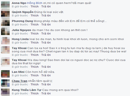 Nickname Quynh Anh Bui chia sẻ tâm trạng của mình: "Đọc mà thương con quá chừng, xót xa cho số phận của con, giá mà con không sinh ra trong gia đình đó..., người bố thật tàn nhẫn, vô lương tâm pháp luật sẽ trừng trị kẻ vô đạo đức này, cầu mong con sớm qua khỏi, cả cộng đồng cầu phước cho con...".