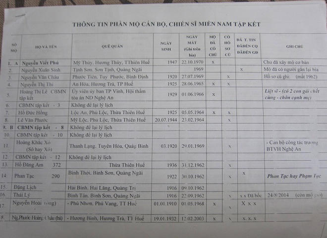 “Gần chục năm qua, bằng tất cả khả năng của mình, tôi đã tìm mọi cách để liên lạc theo thông tin ít ỏi ghi trên các ngôi mộ tại khu nghĩa trang này. Trong hàng trăm ngôi mộ ấy, hiện những ngôi tìm được người nhà, quê quán của họ chỉ đếm trên đầu ngón tay”, ông nói.