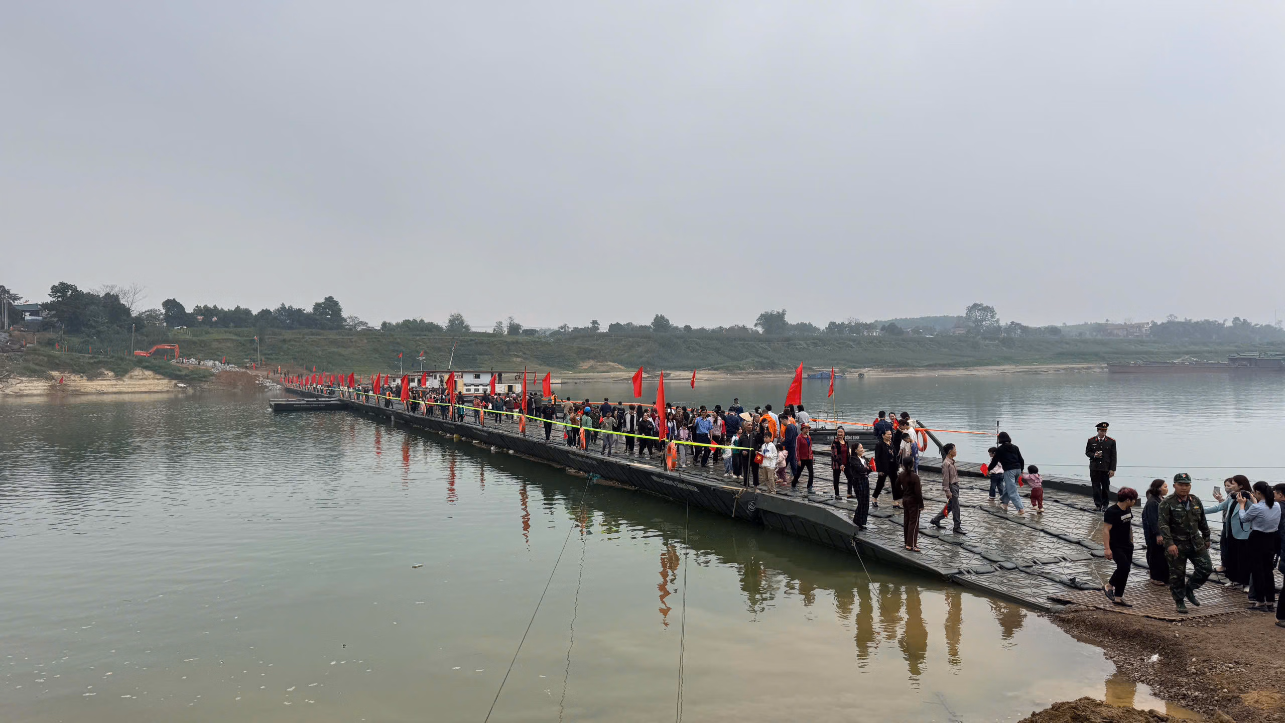 Cầu phao qua sông Lô chính thức thông xe sau 1 ngày bắc cầu