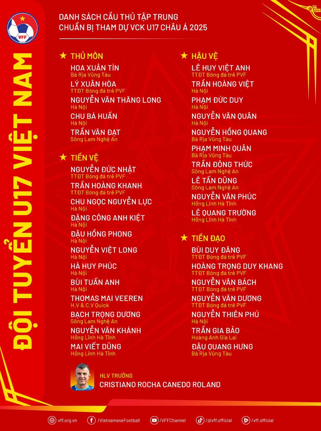 Về cơ bản, lực lượng chủ chốt của đội tuyển U17 Việt Nam vẫn là những gương mặt đã trải qua thử thách tại Vòng loại U17 châu Á 2025 cũng như từng được triệu tập trong các đợt hội quân trước đây. Bên cạnh đó, nhằm gia tăng sức cạnh tranh trong đội hình đội tuyển U17 Việt Nam, HLV Cristiano Roland cũng trao cơ hội cho khá nhiều “tân binh”, trong đó đáng chú ý nhất là sự hiện diện của cái tên Thomas Mai Veeren, một cầu thủ Việt kiều đang thi đấu tại Hà Lan.