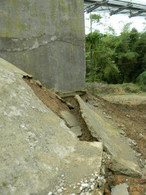 Theo ghi nhận trực tiếp sáng qua (25/11) tại cây cầu “bạc mệnh”, phần đầu cầu nằm bên địa phận thôn 1 (xã Tiên Lãnh) bị lún, nứt, sụp tan hoang không thể lưu thông bằng xe máy. Đặc biệt mặt nền bê tông bị lún, nứt, sụp toàn bộ. Bên thành móng cầu cũng bị nứt toạc kéo theo những mảng tường bê tông ta luy bị đổ xuống mép hố. Những vết nứt mới phát sinh chạy dọc, chạy ngang hai bên hông móng đường nối ngay đầu cầu đếm không hết.