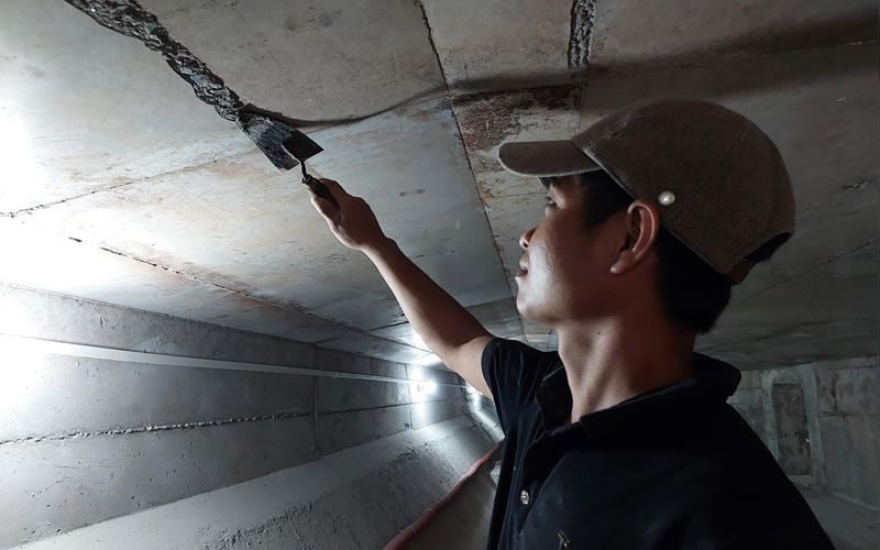 Bên trong bụng cầu, một công nhân đang vá các vết nứt bê tông nhằm chống thấm nước từ phía mặt cầu xuống.