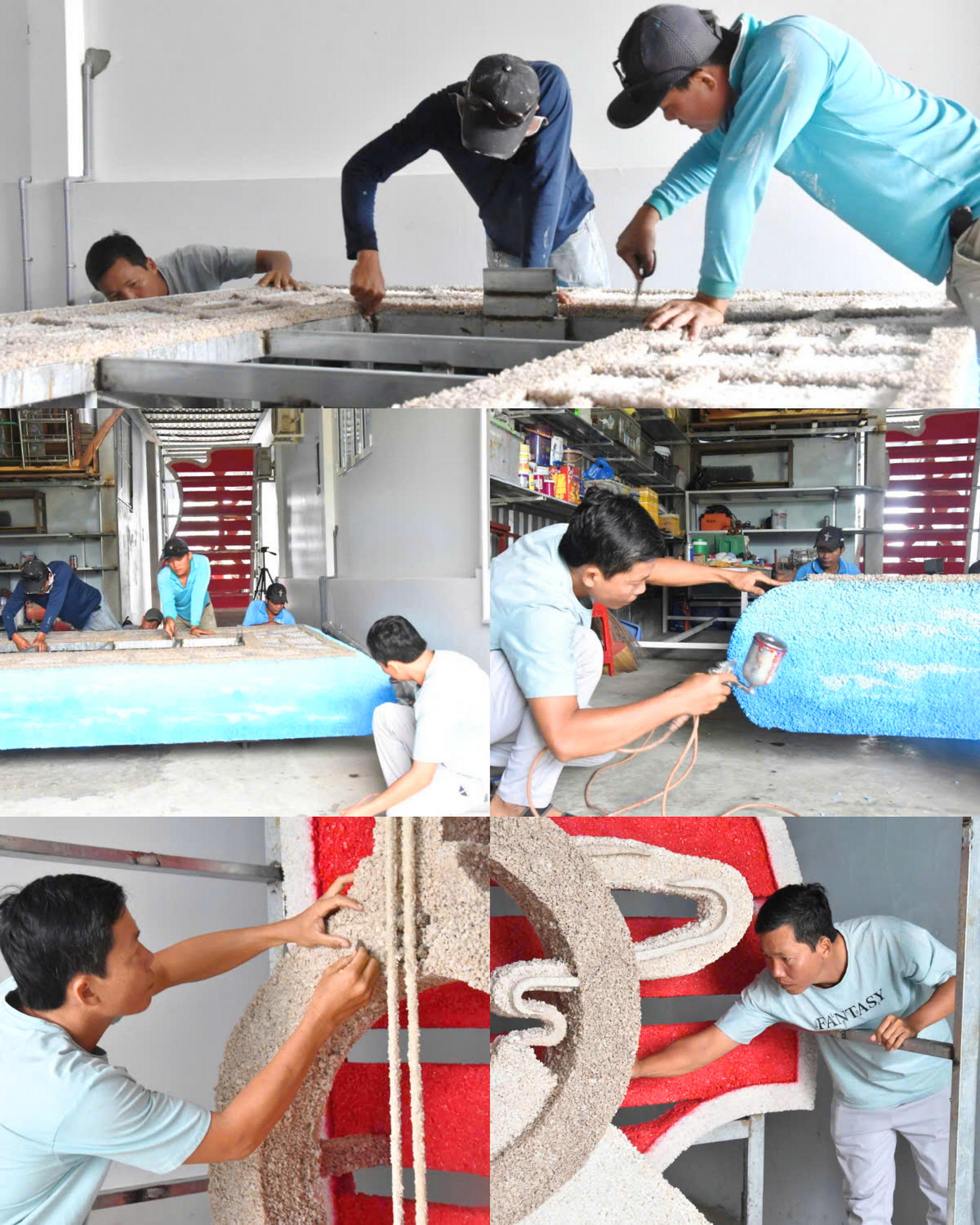 Anh Hồ Chí Ân cùng các cộng sự đốc thúc hoàn thành Cây đàn kìm cách điệu bằng muối. |