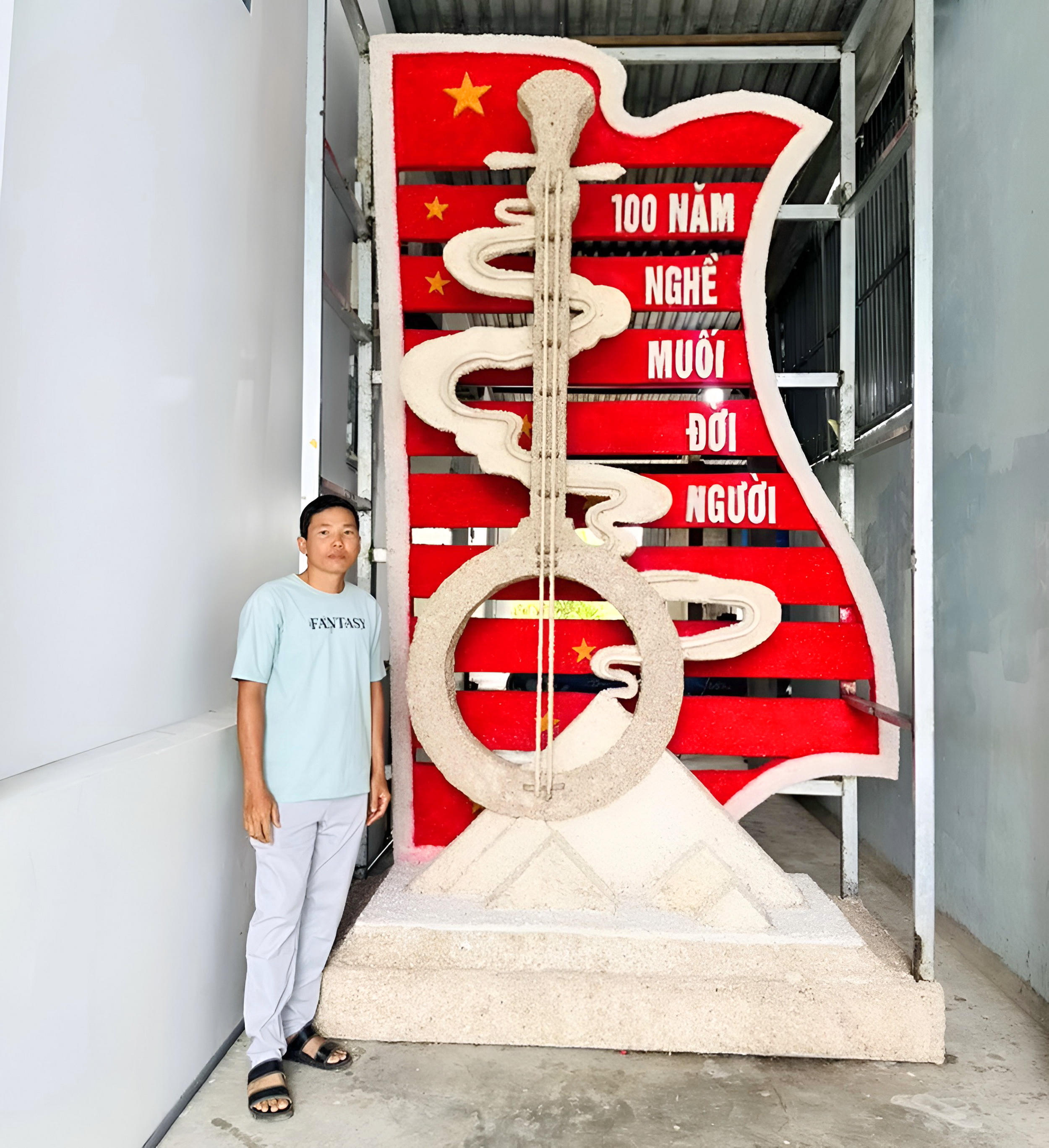 Anh Hồ Chí Ân với Cây đàn kìm cách điệu bằng muối có chiều cao khoảng 4 mét, nặng khoảng 500kg. |