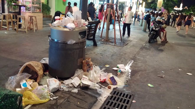 Những thùng rác được bố trí dọc phố đi bộ Nguyễn Huệ không chứa hết lượng rác thải mà người đi xem pháo hoa để lại.
