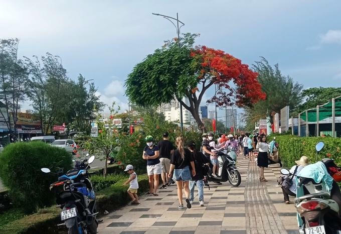Đầu tháng năm, cây phượng trên đường Thùy Vân trở thành điểm check in yêu thích của nhiều người ở Vũng Tàu. Điều độc đáo là cây phượng chỉ ra hoa một nửa, đỏ rực, cánh rụng đầy vỉa hè. Nửa còn lại của cây, lá vẫn xanh mướt. Nhìn từ xa, cây phượng nổi bần bật với hai nửa đối lập. Mỗi ngày, hàng trăm người đến chụp ảnh. Trong số đó, không ít du khách từ nơi khác tới xem vì tò mò.