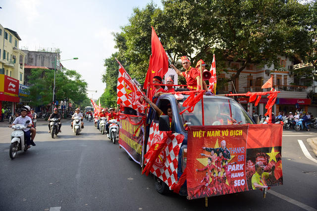 Ngay từ đầu giờ chiều 6/12, hàng trăm cổ động viên (CĐV) đã xuống đường diễu hành để cổ vũ cho đội tuyển Việt Nam gặp Philippines tại Mỹ Đình. Một cổ động viên đã cắt tóc in hình HLV Park Hang Seo để ngầm cảm ơn người "thuyền trưởng" đội tuyển Việt Nam.