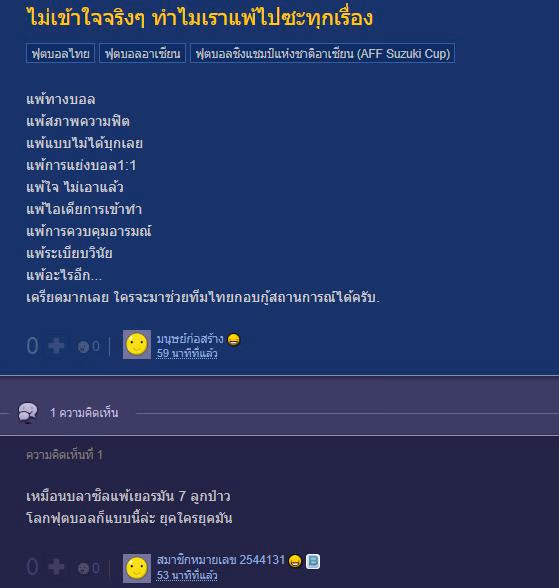 “Không thể hiểu nổi tại sao chúng ta lại thua mọi mặt trước Việt Nam?”, một CĐV của Thái Lan viết trên diễn đàn Pantip. CĐV này viết “Chúng ta thua về kiểm soát bóng, thua cả về thể lực, đánh mất cả thành tích bất bại của mình, thua trong những pha tranh chấp một đối một, thua về tinh thần chiến đấu và ý tưởng triển khai bóng. Các cầu thủ không kiểm soát được cảm xúc và đánh mất tính kỷ luật. Chúng ta thua mọi mặt. Tôi cảm thấy rất căng thẳng. Ai có thể giúp đội bóng hồi phục đây?”.