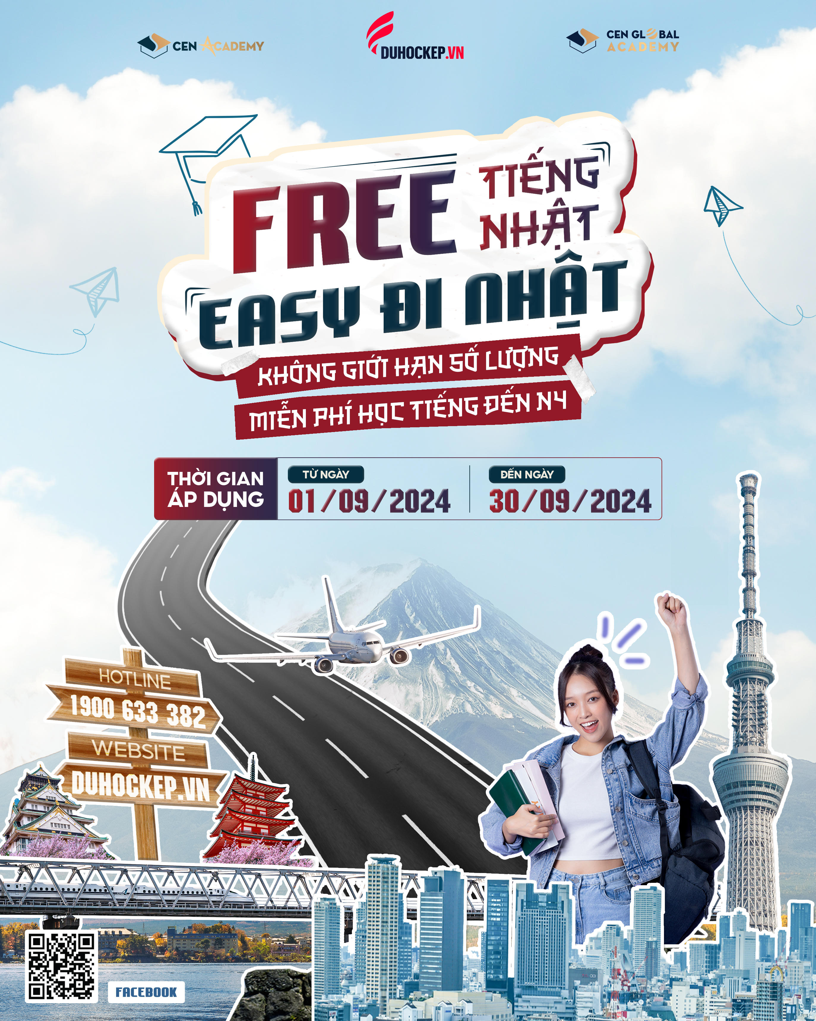 Đặc biệt, Cen Academy hiện triển khai chương trình ưu đãi “Free tiếng Nhật - Easy đi Nhật” miễn phí toàn bộ học phí tiếng Nhật đến trình độ N4, dành cho những học viên thi đỗ chứng chỉ N4 trong lần thi đầu tiên sau 5 tháng kể từ ngày nhập học (có điều kiện kèm theo). Chương trình ưu đãi hấp dẫn dành cho những học viên đăng ký sớm nhất. Liên hệ ngay với Cen Academy để biết thêm thông tin chi tiết.