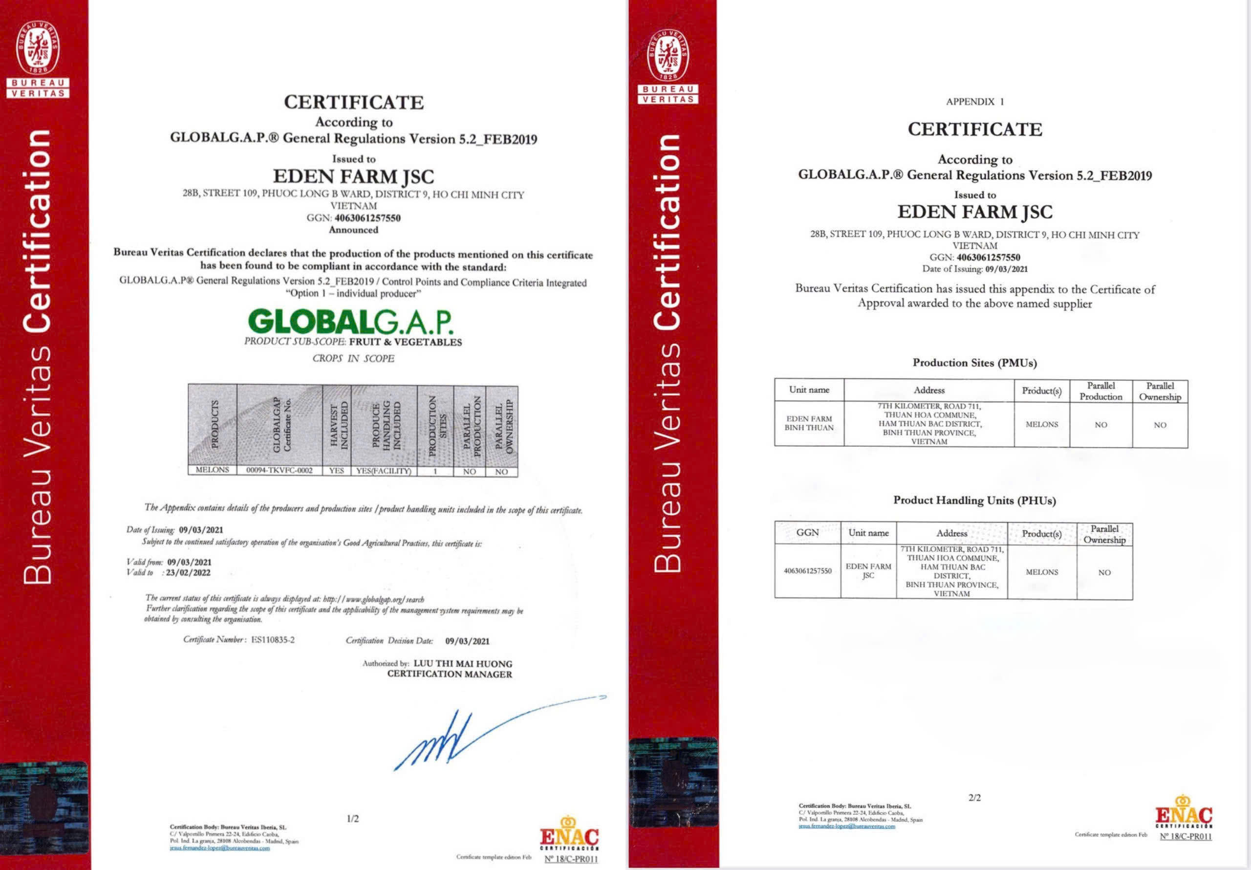Nông trường Eden Farm đạt chứng nhận GlobalGAP. |