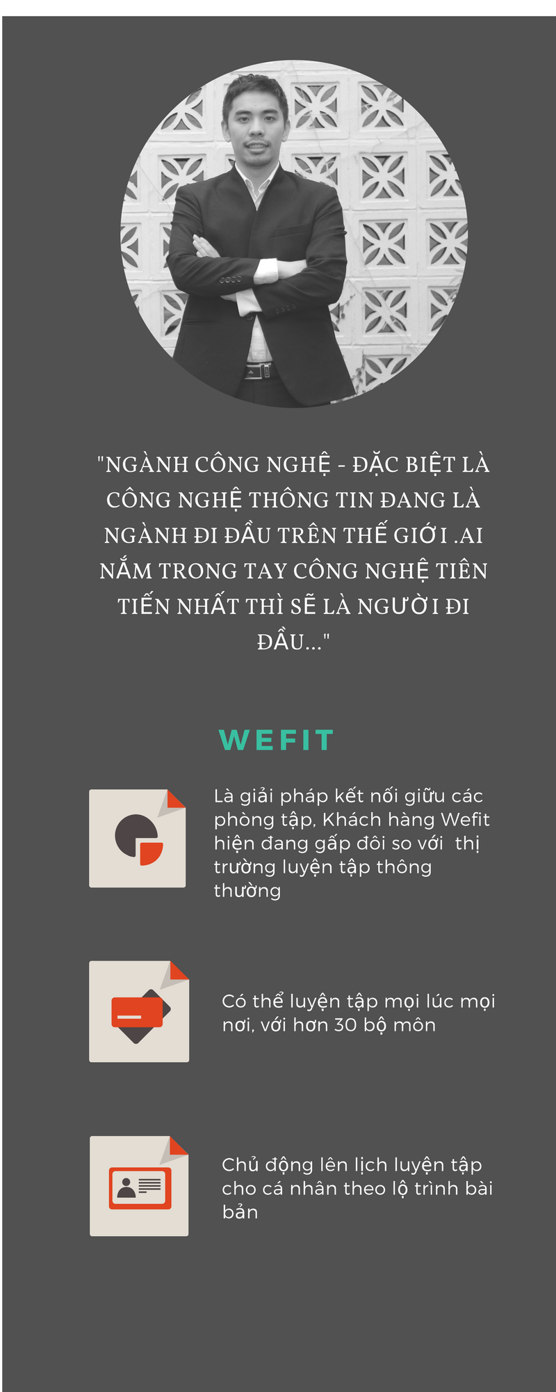(PLO) - Từ chối làm việc tại Microsoft, Nokia- những ông lớn trong ngành công nghệ, chàng kỹ sư máy tính Nguyễn Khôi quyết tâm về nước khởi nghiệp với mong muốn khẳng định bản thân và đem đến nhiều giá trị hơn cho xã hội. Anh cũng là người tiên phong đưa Wefit phát triển với nhiều tính năng hiện đại đáp ứng nhu cầu sức khỏe và thể hình.