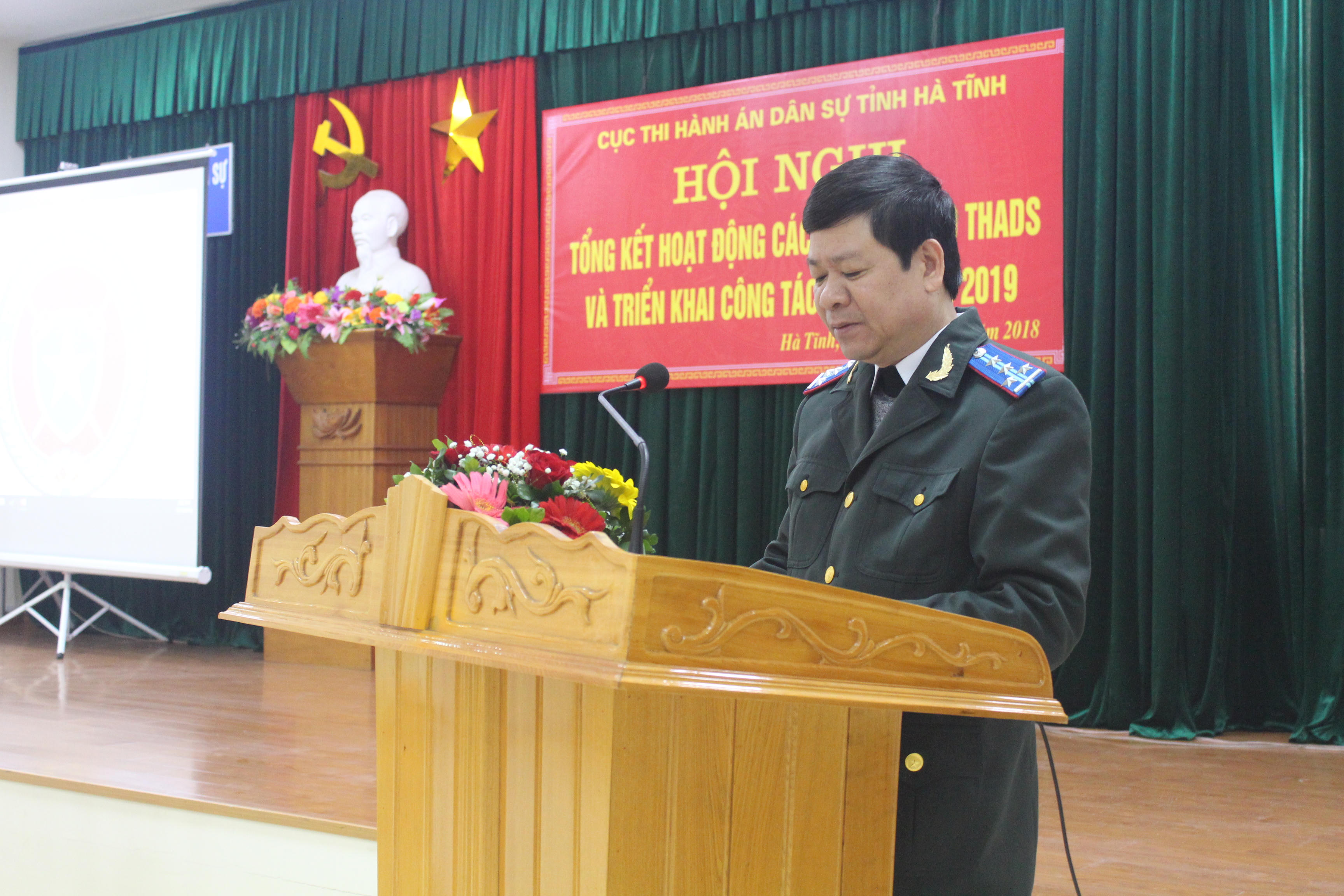 Bức ảnh chụp ông Nguyễn Văn Cường tại Hội nghị Tổng kết công tác Cục THADS tỉnh Hà Tĩnh năm 2018. |