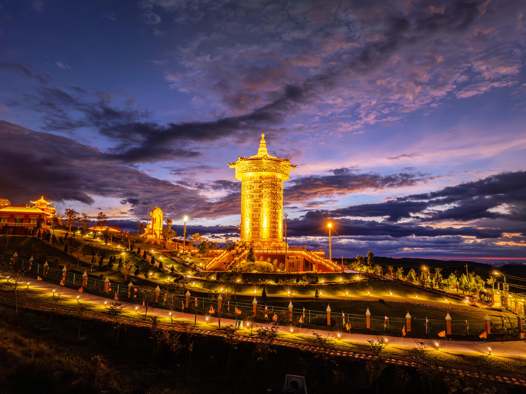 Tĩnh lặng cảm nhận năng lượng tâm linh bên Đại Bảo Tháp Kinh Luân khi những ánh nắng cuối ngày dần chìm xuống. |