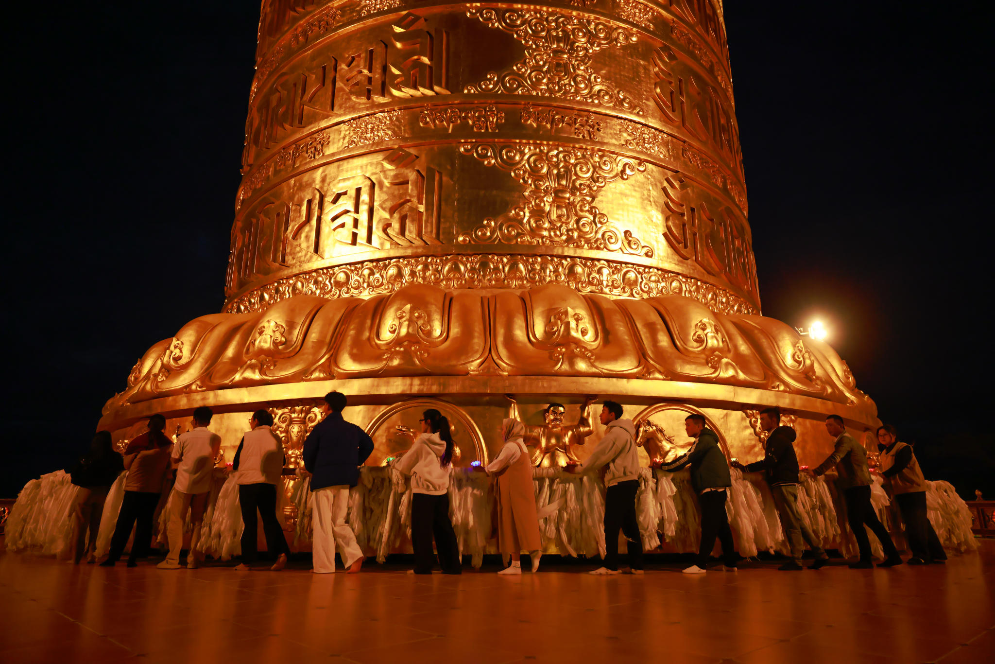 Nhất tâm vừa quay Đại bảo tháp kinh luân vừa cầu nguyện bình an. |
