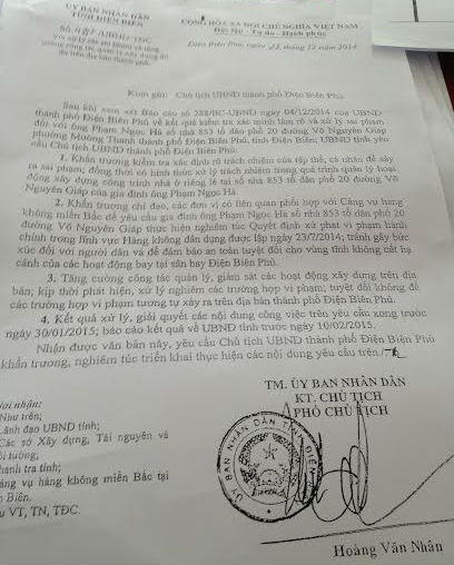 Mới đây nhất, ngày 4/8/2015 UBND tỉnh Điện Biên tiếp tục có văn bản số 2834/UBND-XD (do ông Lê Thành Đô- Phó Chủ tịch UBND tỉnh ký) yêu cầu Chủ tịch UBND TP. Điện Biên Phủ phải nghiêm túc triển khai thực hiện chỉ đạo của UBND tỉnh đối với công trình đe dọa đến an ninh hàng không này, thời gian phải xử lý trước ngày 30/8/2015 và báo cáo về UBND tỉnh trước ngày 5/9/2015.