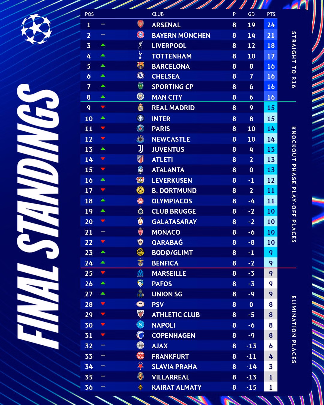 Rạng sáng nay (29/1) giai đoạn vòng bảng phân hạng đã khép lại một cách đầy kịch tính với 18 trận đấu diễn ra đồng thời. Barcelona và Sporting CP giành lại vị trí trong top 8 cùng với Bayern và năm đội bóng Anh khác.