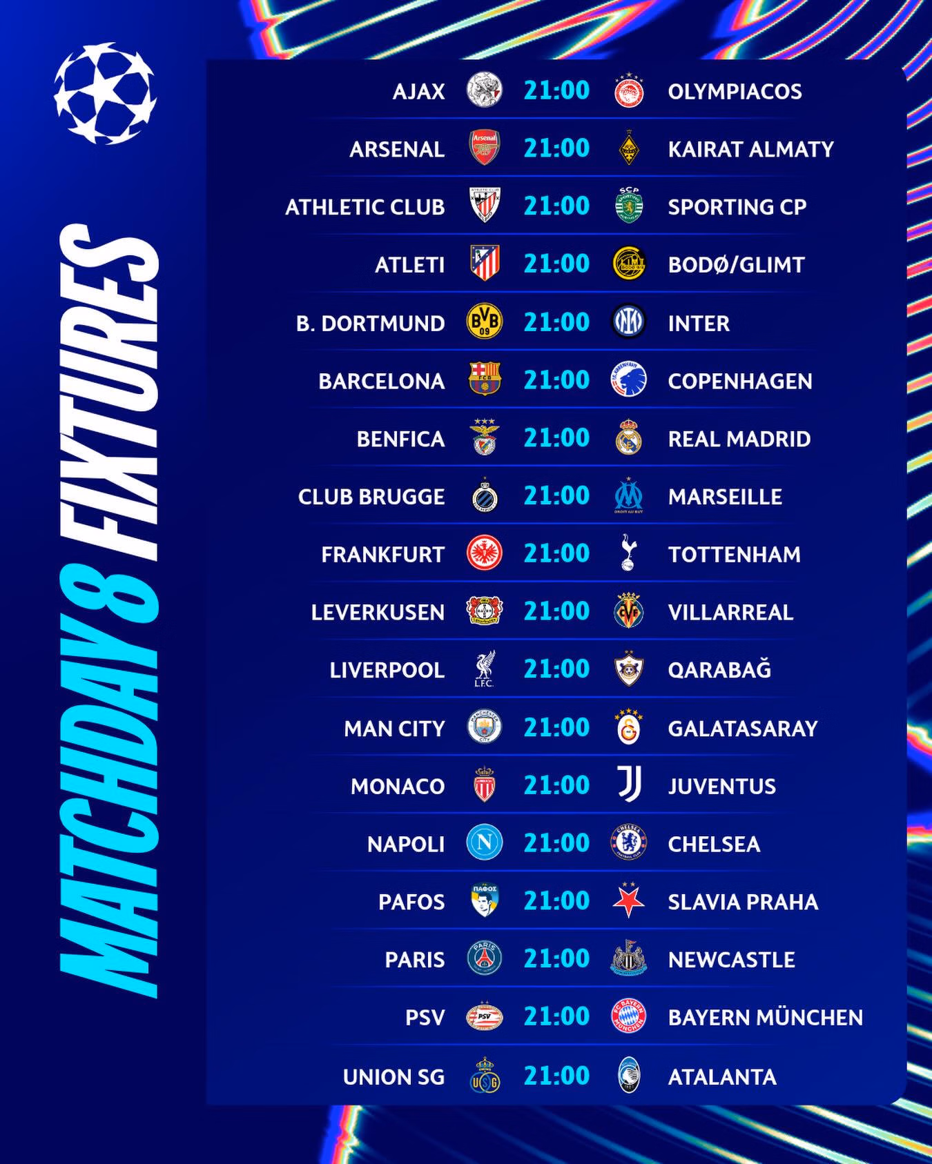 Các cặp đấu còn lại cũng rất gay cấn khi mà các đội vừa đua tranh vào top 8 thì nhóm cuối cố gắng tranh giành tấm vé dự vòng play-off để tranh suất đi tiếp. Như cuộc đụng độ giữa Ajax và Olympiakos.