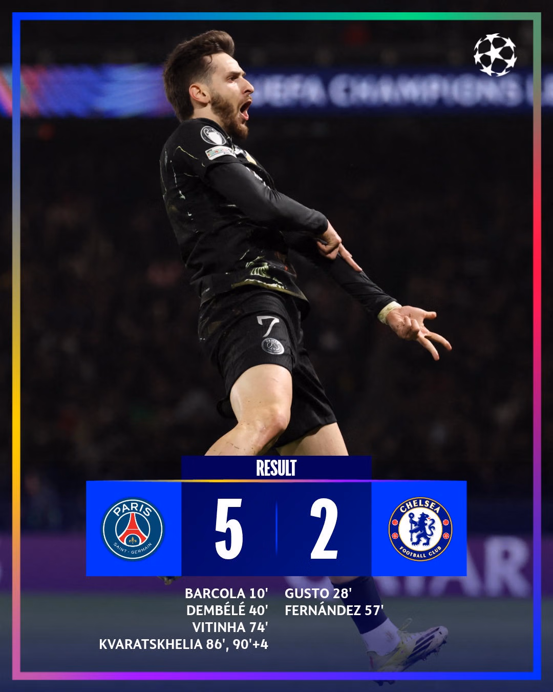Đương kim vô địch Paris Saint-Germain đã giành chiến thắng ấn tượng 5-2 trên sân nhà trước Chelsea trong trận lượt đi vòng 16 đội vào rạng sáng nay (12/3), trong khi Federico Valverde lập hat-trick giúp Real Madrid nới rộng khoảng cách 3 bàn thắng trước Man City.