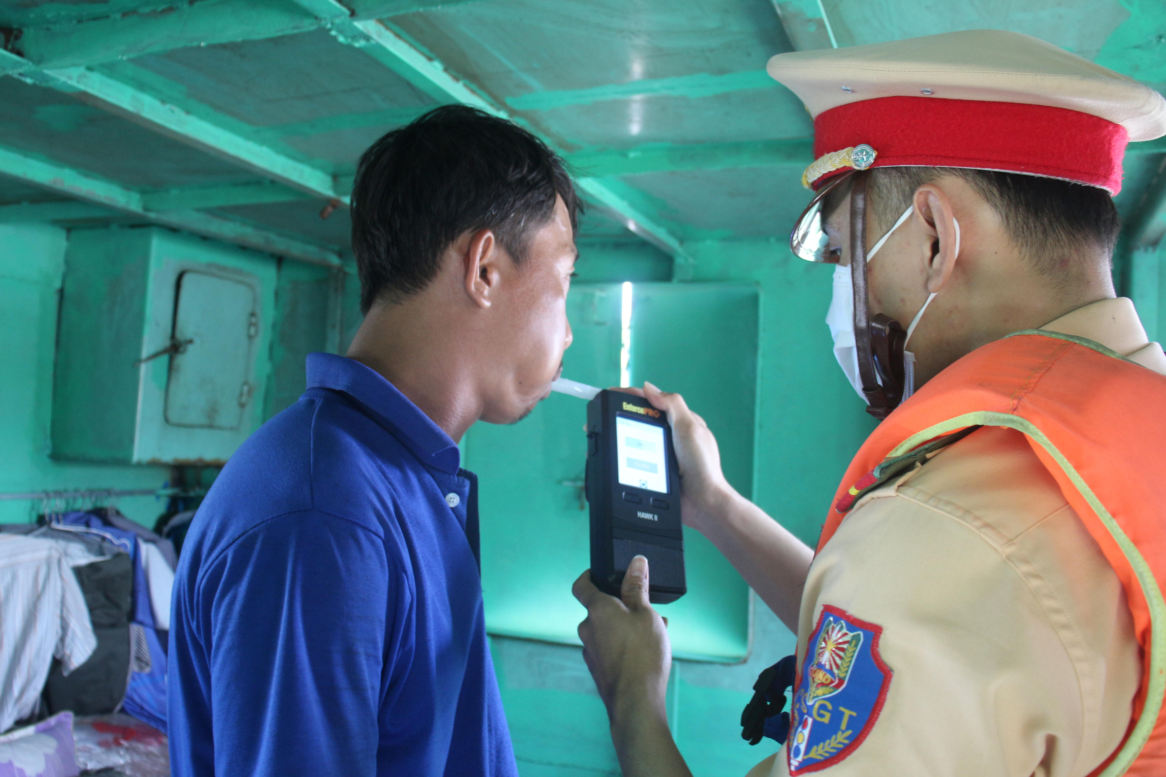 Kiểm tra nồng độ cồn người điều khiển phương tiện giao thông đường thuỷ nội địa. Ảnh: Nhựt Nam |
