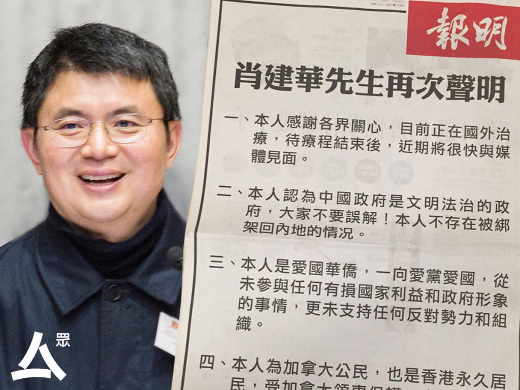 Ngày 31/1, trang Wechat chính thức của tập đoàn Tomorrow Group đã đăng bản tuyên bố ký tên Tiêu Kiến Hoa, trong đó nói “bản thân đang chữa bệnh ở nước ngoài; cho rẳng chính phủ Trung Quốc pháp trị văn minh, không tồn tại chuyện bắt cóc người đưa về Đại Lục; bản thân không tham gia bất cứ chuyện gì gây tổn hại đến lợi ích quốc gia và hình ảnh của chính phủ; cũng chưa từng ủng hộ bất cứ thế lực hay tổ chức chống Trung Quốc nào; là công dân Canada, cũng là cư dân có quyền cư trú lâu dài ở Hong Kong, bản thân được Lãnh sự quán Canada bảo hộ và cũng được luật pháp Hong Kong bảo vệ, đồng thời có hộ chiếu ngoại giao nên được hưởng quyền miễn trừ ngoại giao”, để chứng tỏ mình không phải bị bắt cóc đưa đi. Ngày 2/2, một tuyên bố tương tự được đăng trên trang quảng cáo của tờ Minh Báo, tuy nhiên, sau đó những tuyên bố trên đã bị gỡ bỏ.