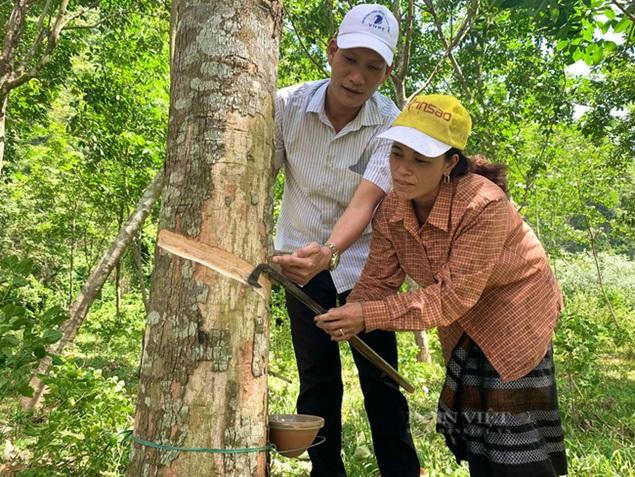 Chị Nguyễn Thị Hoan đang cạo mủ cây cao su. (Ảnh: Trần Anh) |